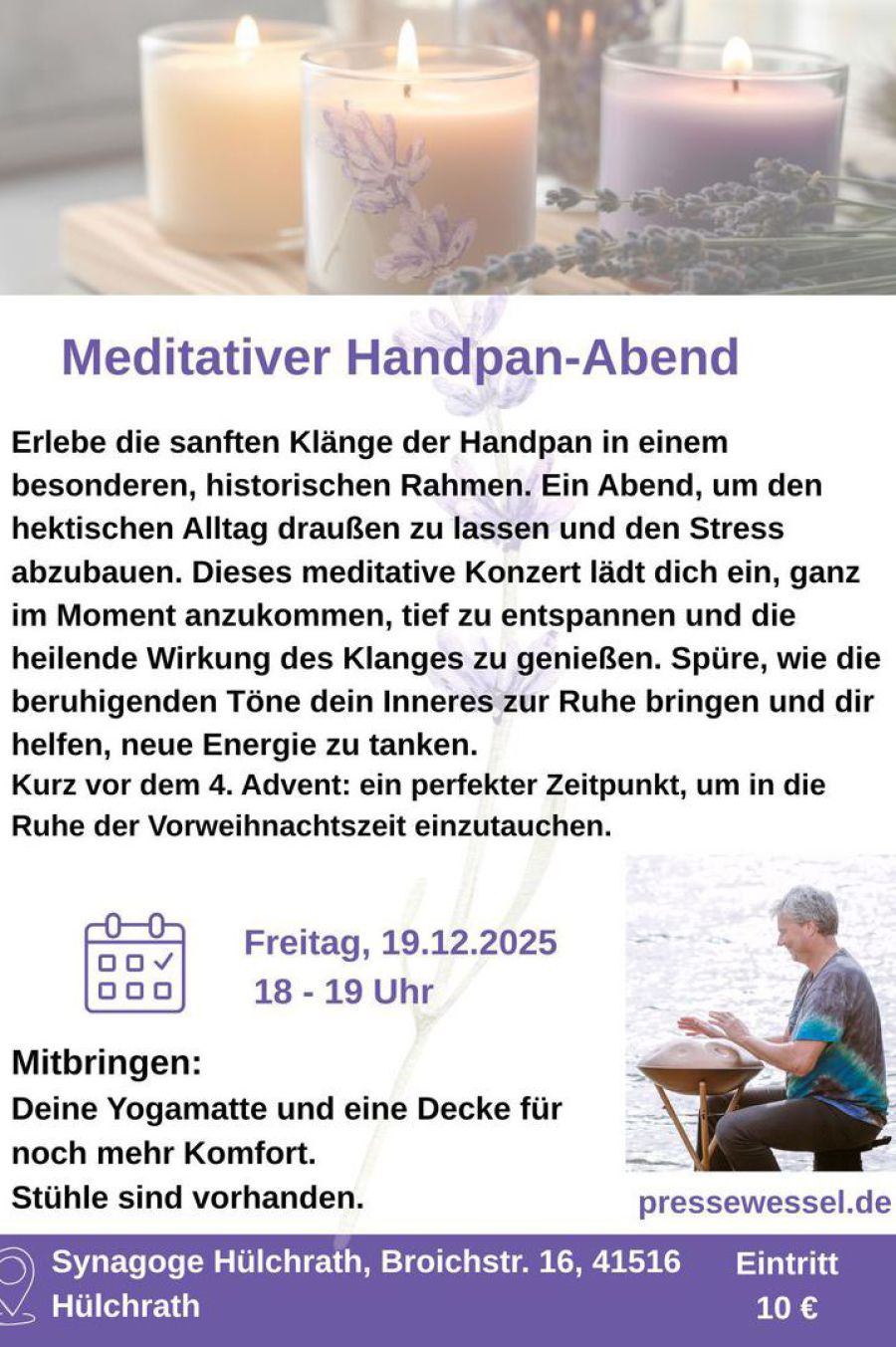 Der meditative Handpan-Abend ist eine Kombination aus Konzert und Therapie: Einerseits mache ich Musik zum Zuhören. Andererseits regen die spährischen Klänge der Handpans und der historische Raum der Synagoge zum Entspannen, Meditieren und zu einer gedanklichen Reise an. Vergessen Sie für einen Moment den Alltag, nutzen Sie die Chance, zu regenerieren und frische Energie zu tanken.
