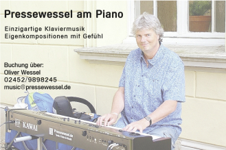 Wer würde einen Pianisten im Freibad vermuten? Am Klavier, nicht im Wasser. 2016 gab es Live-Musik im PianoCafé auf der Kioskterrasse des Freibads Heinsberg-Kirchhoven. In angemessener Kleidung, versteht sich. Die lange Warmbadenacht im August 2016 war auch lange Piano-Nacht: Wasser 30 Grad, Pianomusik live ab 19.00 Uhr, Badegäste rund 5.000. Leider sorgte ein Gewitter um Mitternacht für den vorzeitigen Abbruch und die Flucht des Pianisten ins Trockene.